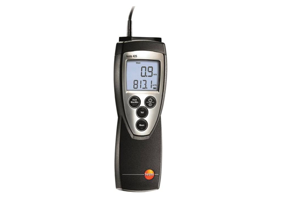 The testo 425 air velocity meter enables quick spot measurements in ventilation ducts. It records the flow speed, calculates the volumetric flow and also measures the temperature. With a measuring range of 0 to +20 m/s, this air velocity meter is particularly well suited to low air flow velocity.